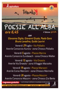 Giunge alla sua quarta edizione la rassegna “Veneto, una poesia dall’alba al tramonto”, un’iniziativa dell’Associazione Teatro dei Pazzi che porta la bellezza della poesia e della musica nei luoghi più suggestivi della nostra regione. Partita 13 anni fa con gli appuntamenti all’alba sulle spiagge jesolane, la manifestazione arriva quest’anno ad abbracciare un territorio che va da San Michele al Tagliamento al Lago di Garda, con eventi dalla costa all’entroterra presentati non solo al sorgere del sole ma anche nella magica atmosfera del tramonto.